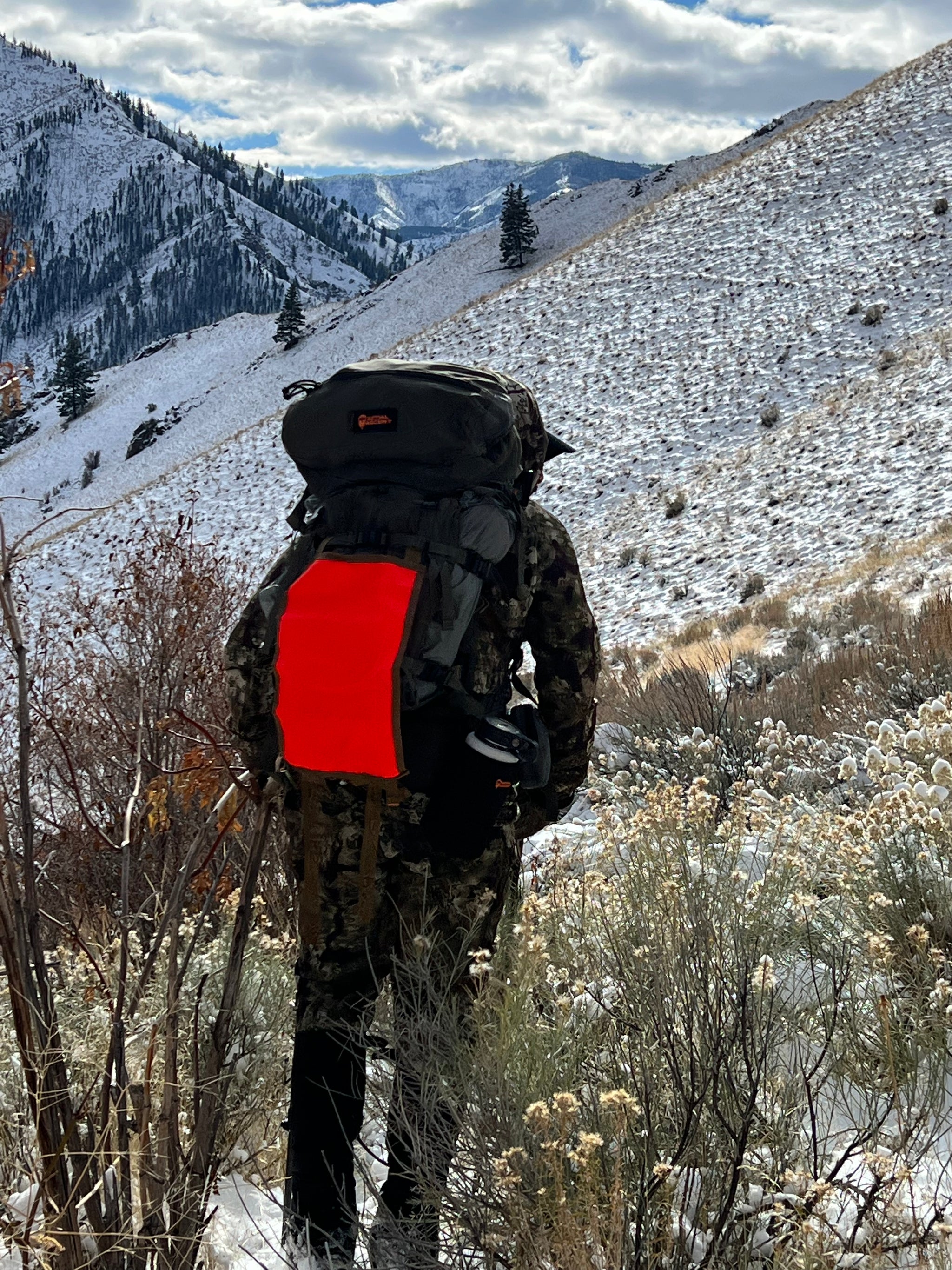 At Initial Ascent, we are all about safety in the backcountry. Introducing the IA Safety Flap. This bright, Hunter's Orange Safety Flap attaches to any pack and weighs only 2 oz. At 126 square inches of bright orange, it will help you stay visible to other hunters so there's no chance of mistaken identity.
